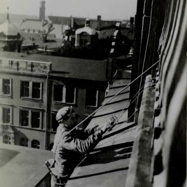 Wir können auf außergewöhnliche Arbeitsaufträge in unserer Firmengeschichte zurückblicken: Zum Beispiel die Montage von Blitzableitern auf bedeutenden Augsburger Gebäuden wie dem Rathaus, Perlach und einem Wasserturm. Besonders bemerkenswert war die Ausführung dieser Arbeiten ohne Gerüst, lediglich mit Hilfe von Strickleitern.