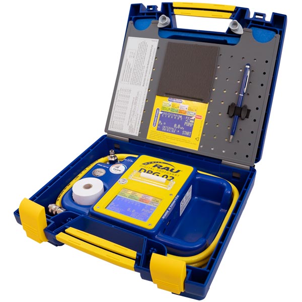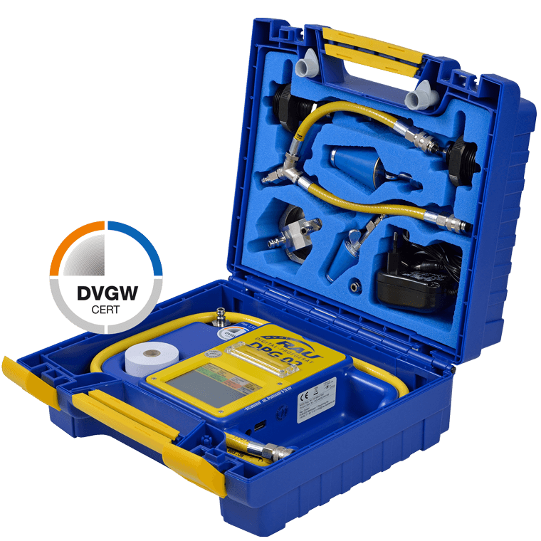 - Gebrauchsfähigkeitsprüfung bei Betriebsdruck 24, 50, 70 und 100 hPa nach TRGI 2018 ohne Ermittlung des Leitungsvolumens, Leckmengenmessung zertifiziert nach DVGW-G 5952, keine zusätzliche Einspeisevorrichtung erforderlich!