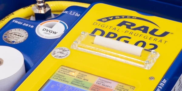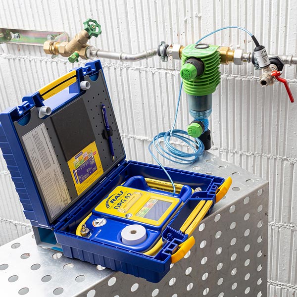 - Dichtheits- und Belastungsprüfung von Wasserleitungen mit Medium Luft (150 hPa/3 bar) nach DIN EN 806-4 (mit ext. Drucksensor WPS; optional)